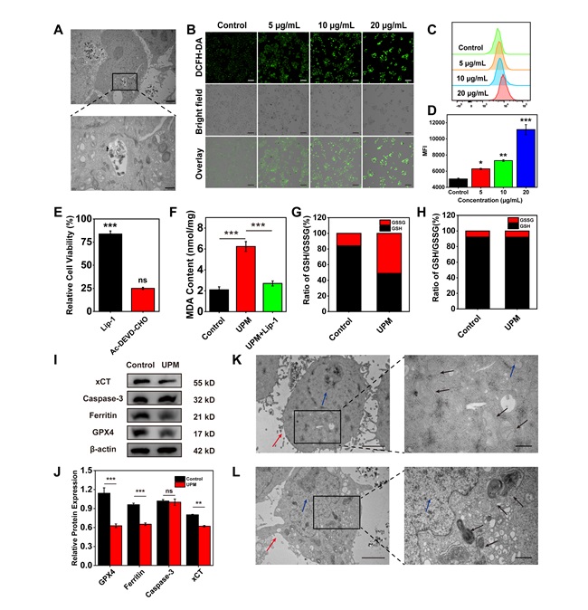 (A)CAL27细胞对UPM的内吞作用和亚细胞定位;(B-D)不同浓度UPM处理CAL27细胞后的ROS水平;(E)Lip-1或Ac-Deve-CHO存在下,CAL27细胞与UPM共培养的相对细胞活力;(F)CAL27细胞内丙二醛含量。(G, H)UPM对CAL27细胞(G)和HACAT细胞(H) GSH / GSSG的影响;(I, J)UPM处理的CAL27细胞中xCT、Caspase-3、Ferritin和GPX4的蛋白表达;(K, L)对照组(K)和UPM组(L)的CAL27细胞线粒体形态变化,蓝色、黑色和红色箭头分别指向细胞核、线粒体和细胞膜。