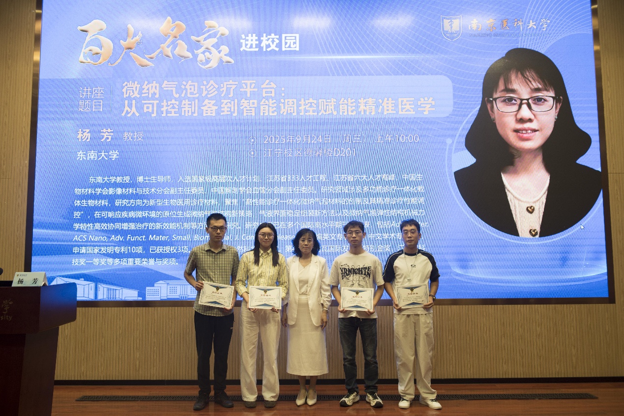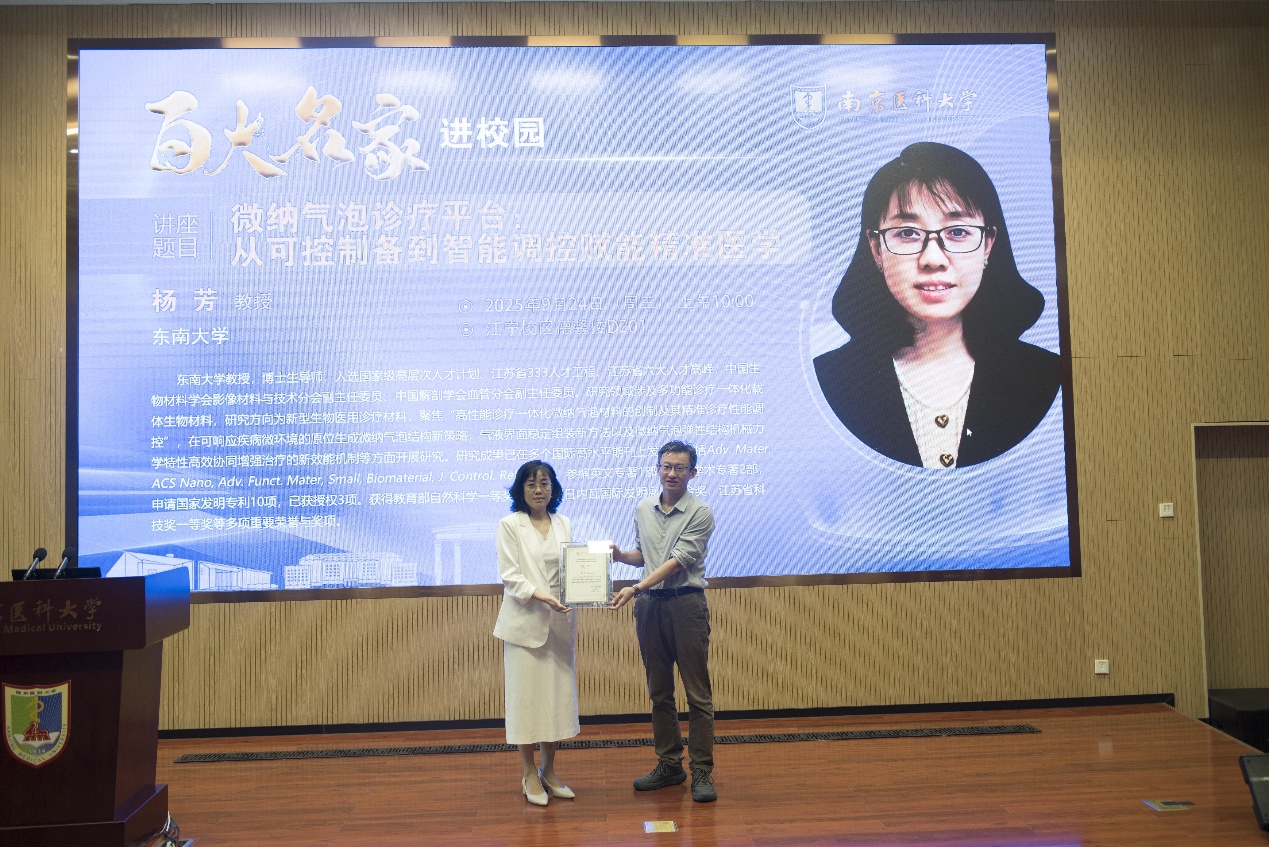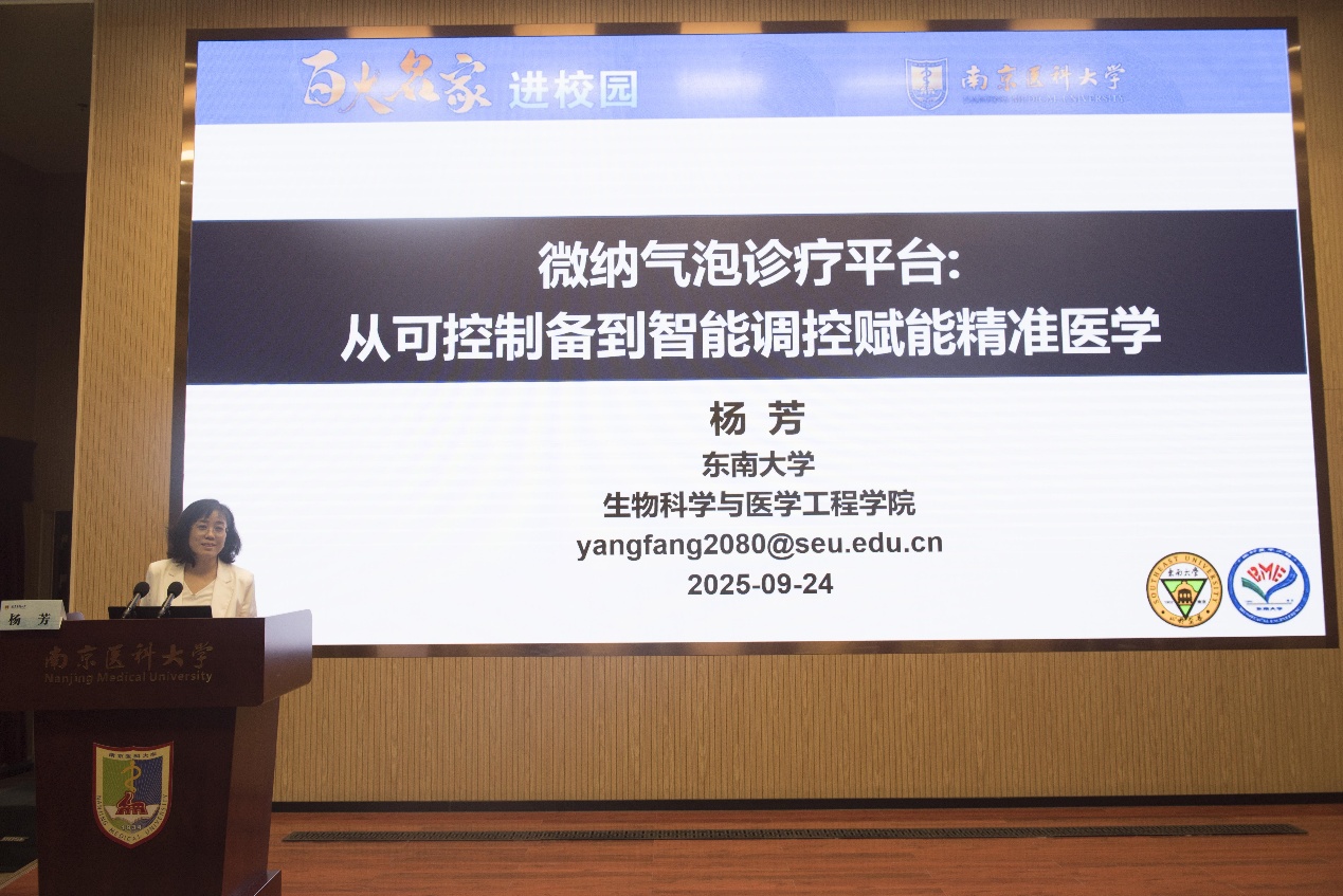 9月24日,2025年南京医科大学“百大名家进校园”系列讲座在江宁校区德馨楼D201成功举办。东南大学生物科学与医学工程学院杨芳教授受邀为我校师生带来主题为“微纳气泡诊疗平台:从可控制备到智能调控赋能精准医学”的学术报告。南京医科大学科研院规划处处长周其冈、生物医学工程与信息学院副院长胡本慧等出席了本次讲座。