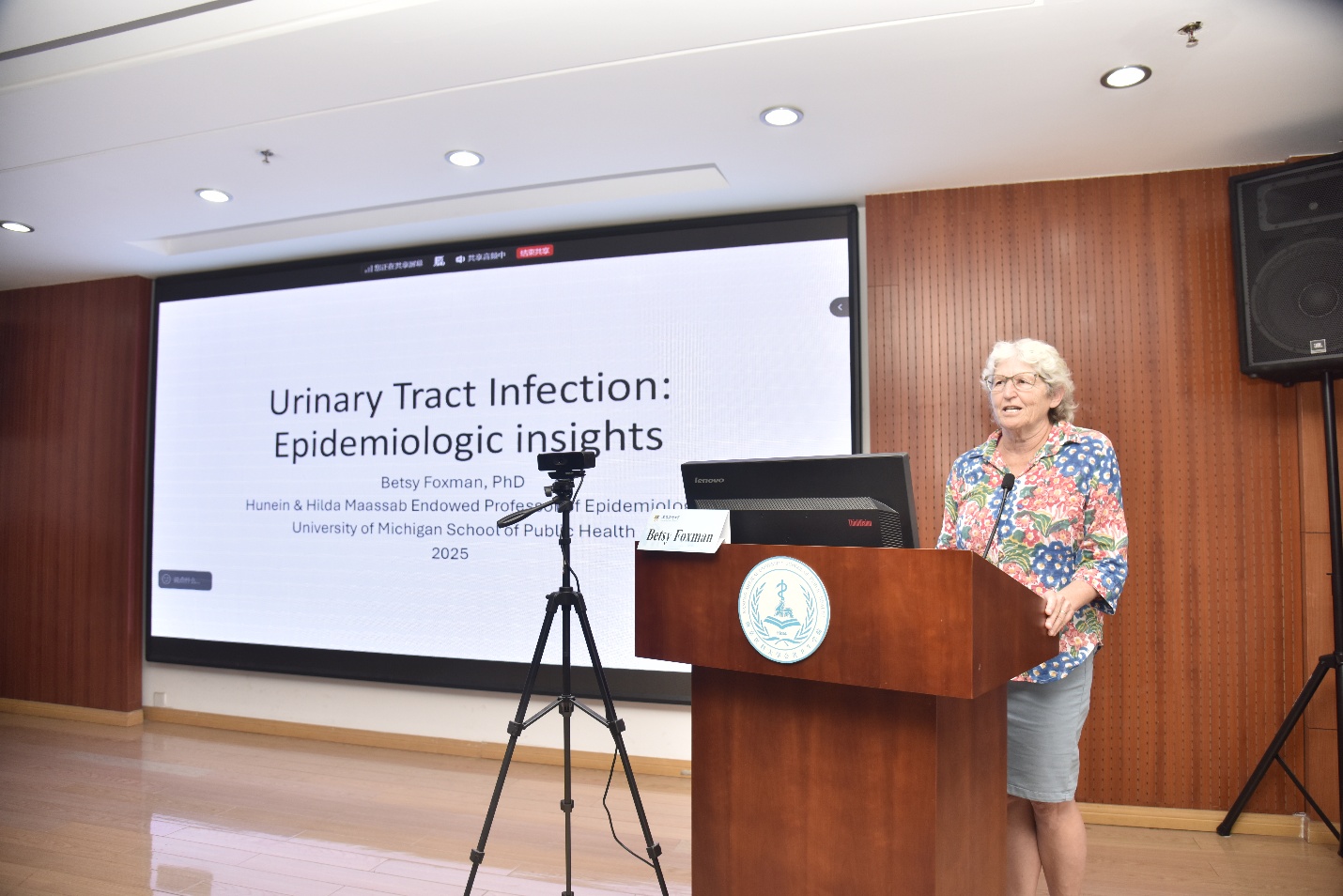 学术报告环节由公共卫生学院流行病学系尹先勇教授主持。Betsy Foxman教授在报告中从尿路感染的定义着手,系统介绍了尿路感染的分子流行病学特征,深入剖析了与感染风险相关的机体特征、行为因素,着重强调了病原体在尿路感染及其耐药中的作用。她强调,基于分子分型的流行病学研究为揭示尿路感染的传播规律和复发机制提供了关键证据,而宿主微生物组与病原体的相互作用已成为开发新型干预措施的重要方向。