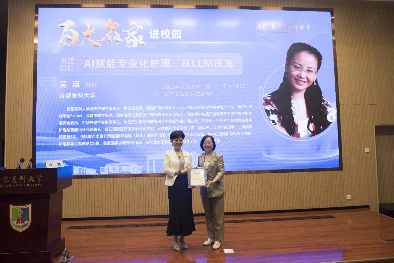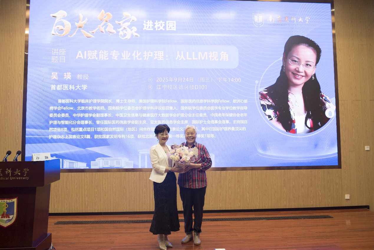 9月24日,2025年南京医科大学“百大名家进校园”系列学术讲座在江宁校区德馨楼D201成功举办。首都医科大学临床护理学院吴瑛教授应邀为师生们带来题为“AI赋能专业化护理:从大型语言模型(LLM)视角”的精彩讲座。本次讲座由南京医科大学科研院规划处周其冈处长主持,来自我校17家附属医院、教学医院的护理部主任、副主任、青年骨干,学院青年联合会成员以及研究生、SPRING创新团队等百余人现场参会。