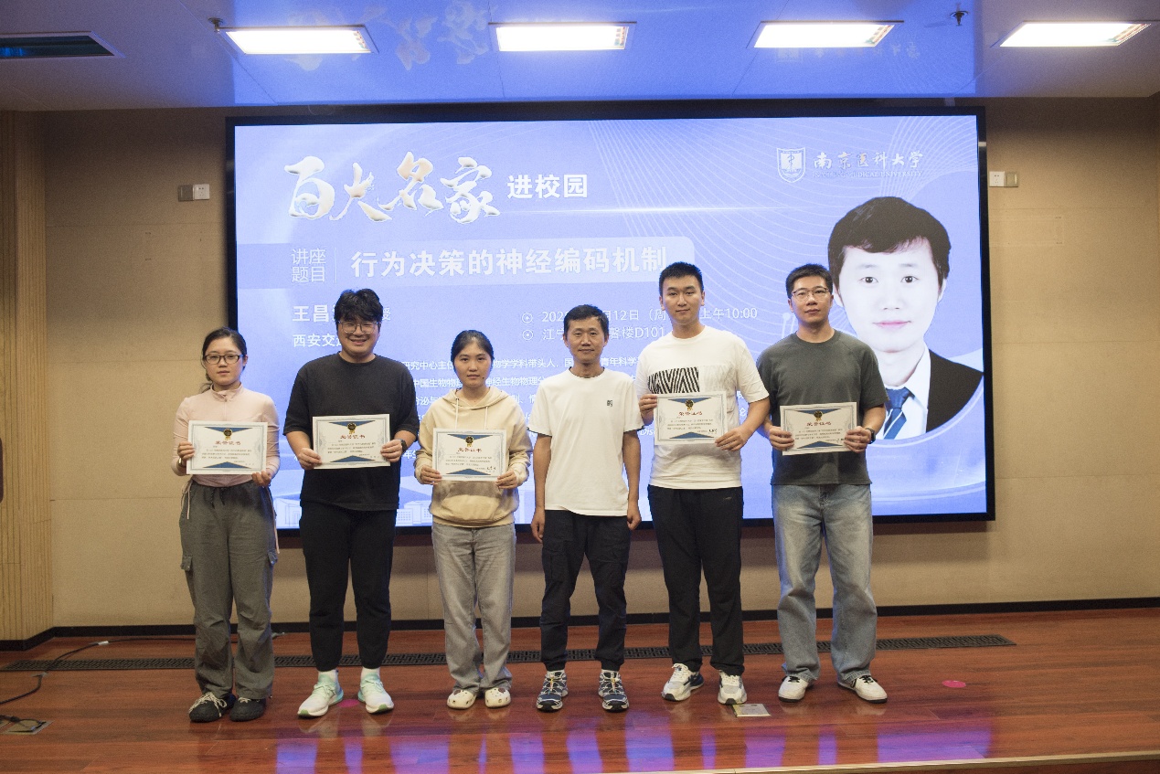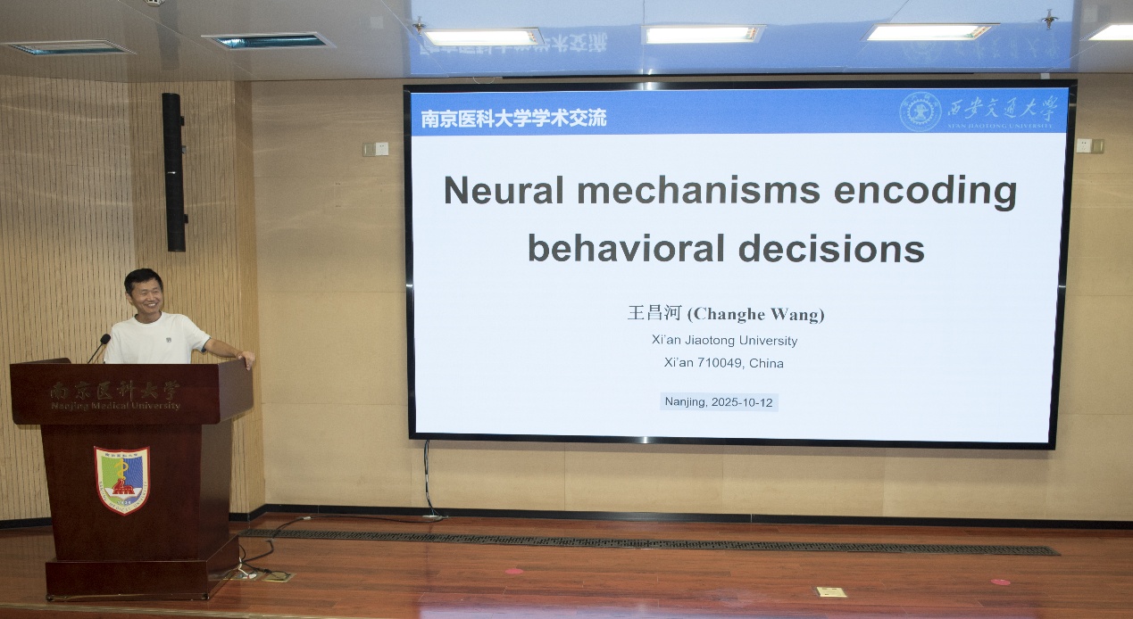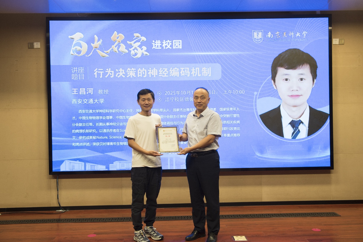 10月12日,2025年南京医科大学“百大名家进校园”系列学术讲座在德馨楼D101隆重召开。西安交通大学王昌河教授受邀为我校师生带来了主题为“行为决策的神经编码”的学术报告。南京医科大学药学院韩峰院长、科研院规划处周其冈处长、基础医学院卢应梅教授等出席了本次讲座。