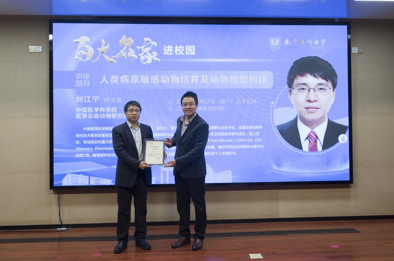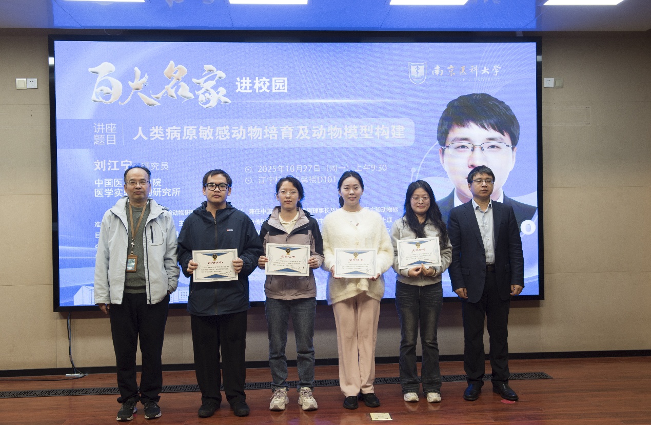 10月27日,2025年南京医科大学“百大名家进校园”系列学术讲座在江宁校区德馨楼D101报告厅隆重召开。中国医学科学院医学实验动物研究所刘江宁研究员受邀为我校师生带来了题为“人类病原敏感动物培育及动物模型构建”的学术报告。南京医科大学科研院规划处处长周其冈、大型仪器创新部主任沈彬、生殖医学与子代健康全国重点实验室李建民教授等出席了本次讲座。