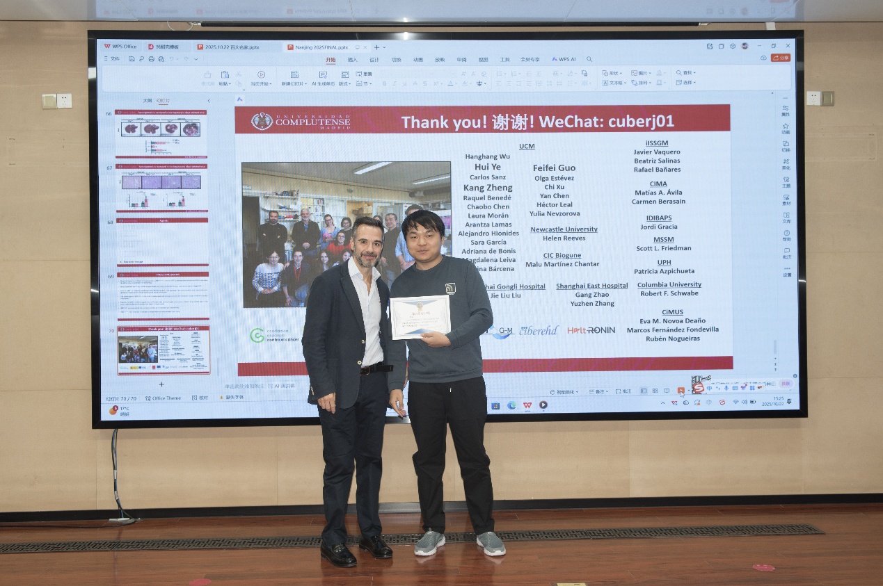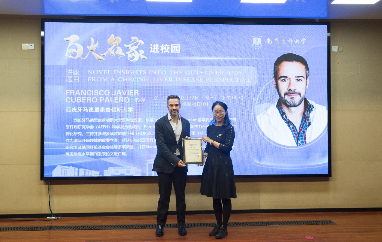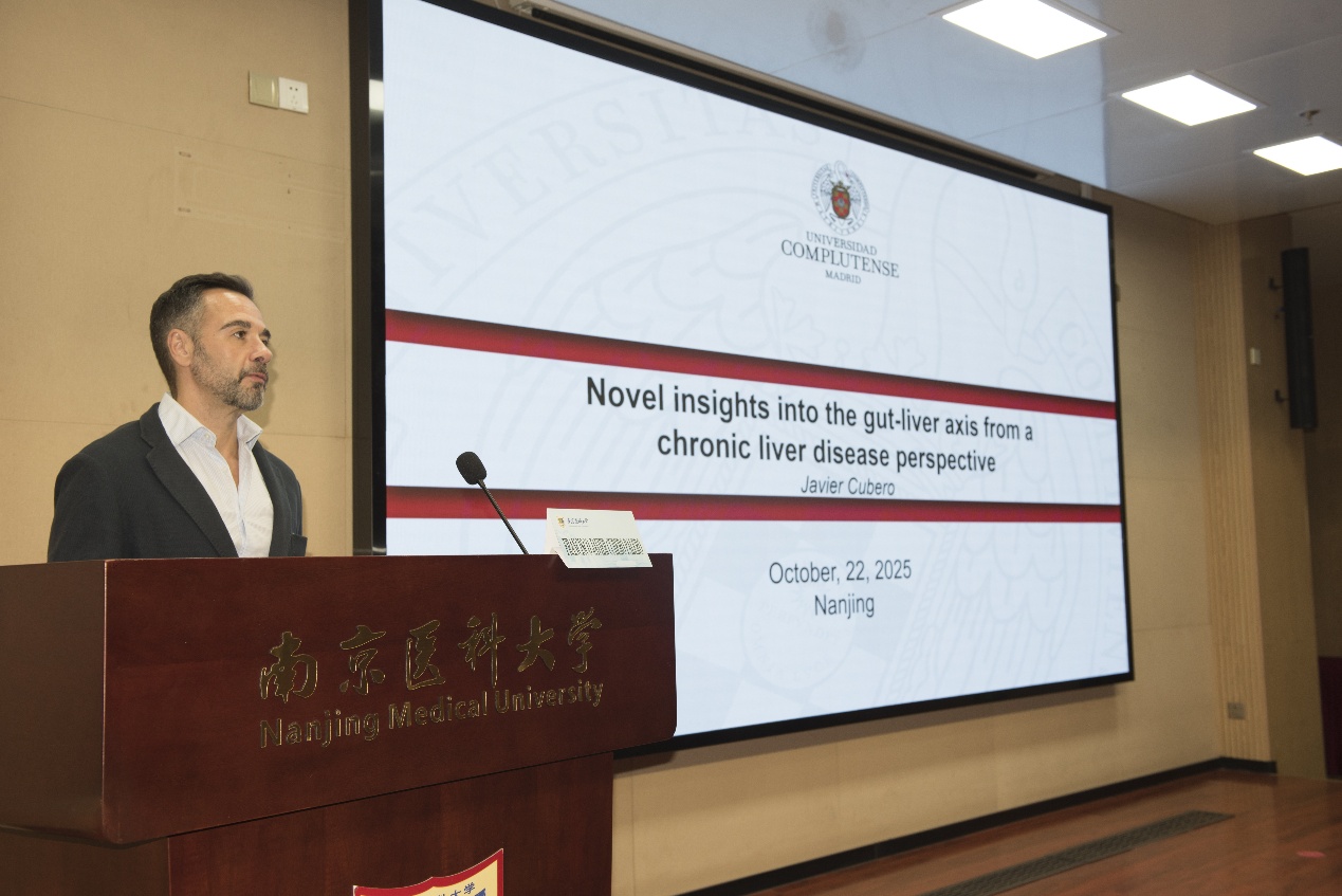 10月22日,2025年南京医科大学“百大名家进校园”系列学术讲座在江宁校区德馨楼D101报告厅隆重召开。西班牙马德里康普顿斯大学医学院Francisco Javier Cubero Palero教授受邀为我校师生带来了主题为“NOVEL INSIGHTS INTO THE GUT-LIVER AXIS FROM A CHRONIC LIVER DISEASE PERSPECTIVE”的学术报告。南京医科大学科研院常务副院长顾爱华、科研院规划处处长周其冈等出席了本次讲座。