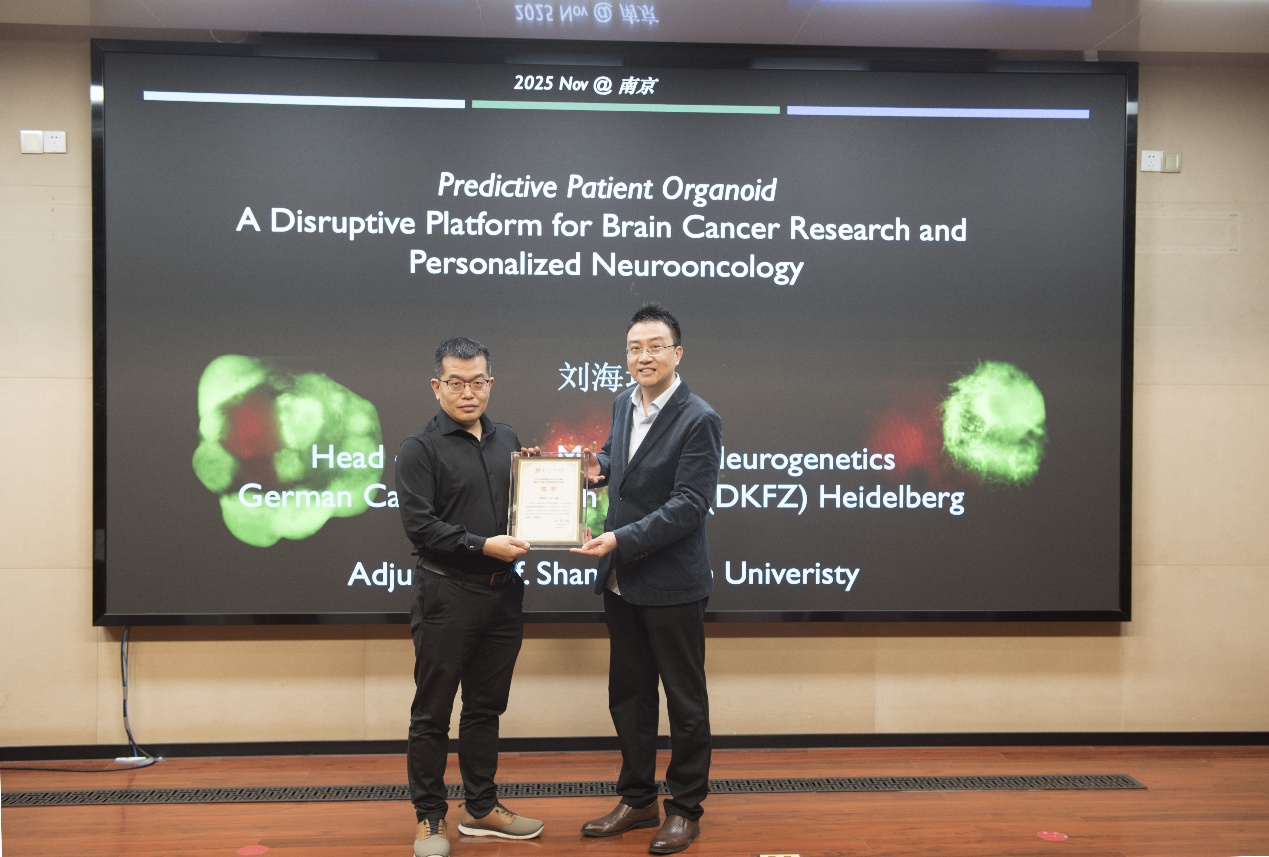 11月13日,2025年南京医科大学“百大名家进校园”系列学术讲座在江宁校区德馨楼D101报告厅隆重召开。来自德国癌症中心的刘海坤教授应邀为我校师生带来了一场题为“Predictive Patient Organoid: A Disruptive Platform for Cancer Research and Personalized Neurooncology”的学术报告。南京医科大学科研院规划处周其冈处长、公共卫生学院钱旭教授等出席了本次活动。