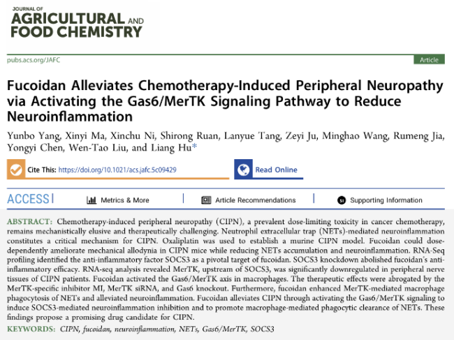 近日,基础医学院刘文涛/胡亮团队在《农业与食品化学杂志》(Journal of Agricultural and Food Chemistry)发表题为《岩藻多糖通过激活 Gas6/MerTK 信号通路减轻神经炎症,缓解化疗性周围神经病变》(Fucoidan Alleviates Chemotherapy-Induced Peripheral Neuropathy via Activating the Gas6/MerTK Signaling Pathway to Reduce Neuroinflammation)的论文。研究从调控机体固有抗炎系统、对抗神经炎症的角度,揭示了岩藻多糖治疗化疗性周围神经病变(CIPN)的关键机制,为CIPN的临床干预提供了潜在治疗药物——岩藻多糖,也为探索神经炎症相关疾病的治疗靶点提供了潜在研究方向。同时,该研究也为岩藻多糖这一“药食同源”提取物的转化应用奠定了理论基础。