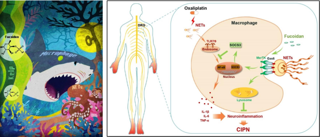 岩藻聚糖(FUC)是一种天然存在的硫酸化多糖,在海藻中含量丰富,具有包括抗炎、肠道屏障保护和抗肿瘤等生物活性。课题组前期研究发现,中性粒细胞胞外诱捕网(NETs)介导的神经炎症是CIPN的关键机制。本研究利用奥沙利铂建立小鼠CIPN模型,发现岩藻多糖呈剂量依赖性缓解CIPN小鼠的机械性痛觉过敏,降低背根神经节NETs累积和神经炎症反应。通过细胞RNA-seq结合GEO数据库数据集分析,团队进一步验证发现,岩藻多糖通过激活 Gas6/MerTK 信号轴,一方面上调SOCS3表达以直接发挥抗炎作用,另一方面通过MerTK促进巨噬细胞对NETs的吞噬清除,“双管齐下”抑制神经炎症。
