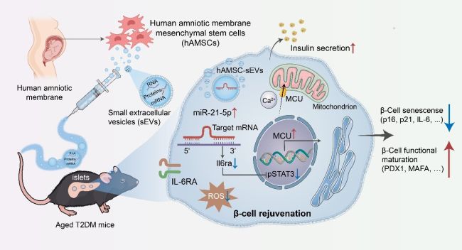糖尿病是一种典型的年龄相关性代谢性疾病。随着人口老龄化进程不断加快,老年2型糖尿病的患病率持续上升,已成为严重威胁人类健康的重要公共卫生问题。然而,针对β细胞衰老本身的安全、有效干预策略仍然十分有限。该研究系统揭示了人羊膜间充质干细胞来源的小型细胞外囊泡在逆转胰岛β细胞衰老中的关键作用。研究发现,该类细胞外囊泡可被衰老β细胞高效摄取,显著改善β细胞的衰老状态,降低多种细胞衰老相关标志物水平,抑制炎症反应,同时恢复β细胞成熟表型和胰岛素分泌能力,从细胞层面实现对β细胞功能的“年轻化”重塑。在衰老糖尿病小鼠模型中,该策略显示出显著的整体治疗效果。研究结果表明,细胞外囊泡治疗可有效降低血糖水平,改善葡萄糖耐量和胰岛素分泌功能,促进胰岛结构和β细胞状态的恢复,且未观察到明显毒副作用,表现出良好的安全性和应用潜力。上述结果提示,通过靶向β细胞衰老本身,有望实现对老年糖尿病的疾病修饰性干预,而不仅局限于传统的对症控制。