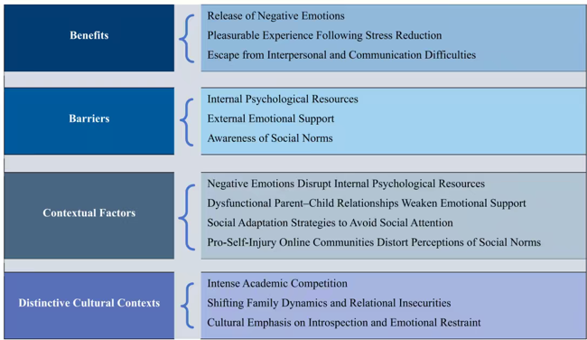 研究结果表明,青少年感知的获益主要体现在三个方面:释放负面情绪、获得压力缓解后的愉悦体验,以及改善人际交流障碍。阻碍则主要包括内在心理资源不足、外部情感支持缺乏和社会规范认知约束三大类。关键情境因素涉及情绪状态、亲子关系质量、社会适应策略及网络社群参与度,这些因素与上述获益和阻碍相互交织。研究还发现,高竞争性的学业环境、亲子关系变动与情感不安,以及强调内省和情感克制的文化传统,构成了影响自伤行为的独特社会文化背景。