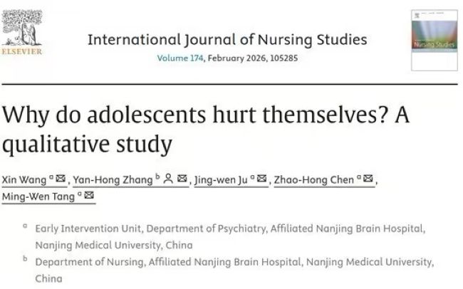 近日,附属脑科医院护理部张燕红副教授团队在护理学领域国际顶级期刊International Journal of Nursing Studies(最新中科院分区为医学大类1区Top、护理小类1区,SCI影响因子7.1,位列全球护理期刊首位)上发表了题为《Why do adolescents hurt themselves? A qualitative study》的原创性研究论文。