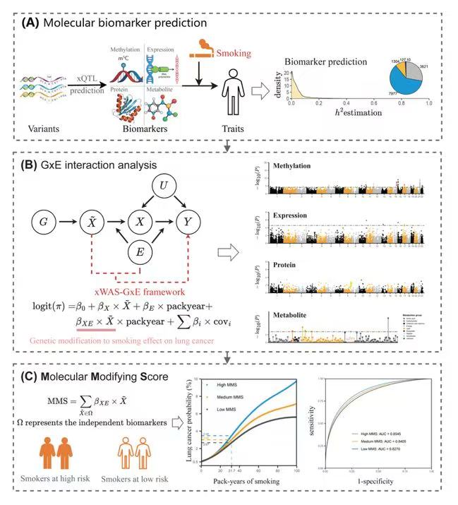 吸烟是公认的肺癌环境暴露因素,但并非所有吸烟者都会罹患肺癌。个体遗传背景如何影响吸烟致癌的效应,一直是领域内的研究热点。研究团队以国际肺癌研究联盟、肺癌跨学科研究联盟、美国癌症筛查试验队列和英国生物标本库约50万人的基因组数据为基础资源,结合大规模的多组学QTL数据,采用高效的统计算法获得了高保真的表观基因组、转录组、蛋白组和代谢组数据,用于后续肺癌多组学基因-吸烟交互作用研究LungCancer-xWAS-GxE。为保证信号识别的可靠性,团队采用“先筛选、再验证”的两阶段分析策略,鉴定出8个与吸烟存在交互作用的生物标志物,包括:尼古丁乙酰胆碱受体区域的DNA甲基化位点、RP11-326C3.14基因表达等。进一步,团队首次提出MMS概念,用于度量基因对吸烟致癌效应的修饰作用,刻画吸烟致癌在个体间的差异,以回答“为何有人吸烟不容易得肺癌”的科学问题。