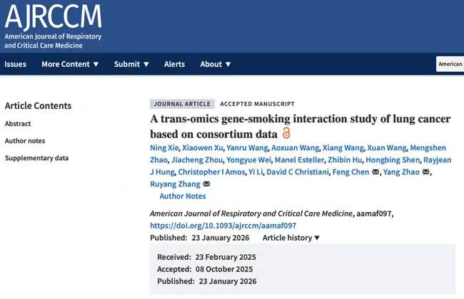 2026年1月,公共卫生学院生物统计学系陈峰、赵杨、张汝阳教授团队在呼吸与危重症医学领域头部期刊《美国呼吸与重症监护医学杂志》(American Journal of Respiratory and Critical Care Medicine)发表了题为《联盟级跨组学肺癌基因-吸烟交互作用研究(A trans-omics gene-smoking interaction study of lung cancer based on consortium data)》的研究论文。该研究针对“临床标本采集难、多维组学检测贵”的难题,采用统计算法整合超大规模人群基因组数据和多种数量性状位点(quantitative trait locus, QTL)数据,以获得高保真多组学数据。研究团队完成了首个覆盖所有组学层面的肺癌基因-吸烟交互作用研究(LungCancer-xWAS-GxE),并创新构建了分子修饰评分(molecular modifying score, MMS)以度量基因对吸烟致癌效应的修饰作用。该研究是“统计学”助力“多组学研究”的有效实践,也为“肺癌高危人群识别、禁烟人群精准防控”提供了理论依据。