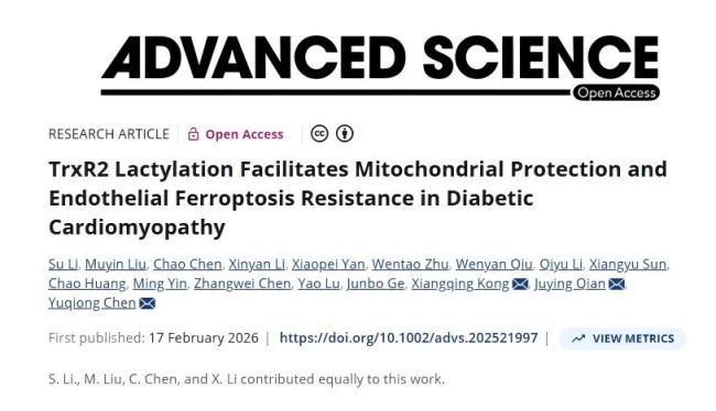 近日,南京医科大学姑苏学院、南京医科大学附属苏州医院心脏内科陈宇琼博士、孔祥清教授与复旦大学附属中山医院心脏内科钱菊英教授合作在《先进科学》(Advanced Science)上发表了题为《TrxR2乳酸化修饰改善糖尿病心肌病线粒体功能并抑制内皮细胞铁死亡》(TrxR2 Lactylation Facilitates Mitochondrial Protection and Endothelial Ferroptosis Resistance in Diabetic Cardiomyopathy) 的研究论文。该研究工作首次揭示了TrxR2乳酰化修饰在糖尿病心肌病中的关键保护作用,为该疾病的靶向治疗开辟了全新路径。