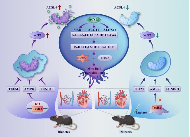 研究团队通过多组学分析、基因编辑动物模型及临床样本验证,发现线粒体硫氧还蛋白还原酶2(TrxR2)是心肌微血管内皮细胞的核心保护因子。其赖氨酸340位点的乳酰化修饰,由线粒体丙氨酰-tRNA合成酶2(AARS2)介导,可显著增强线粒体TrxR活性,激活FUNDC1依赖的线粒体自噬,通过降解SCP2阻断ACSL4线粒体转位,抑制脂质过氧化与铁死亡,改善心肌微血管灌注与心脏功能。