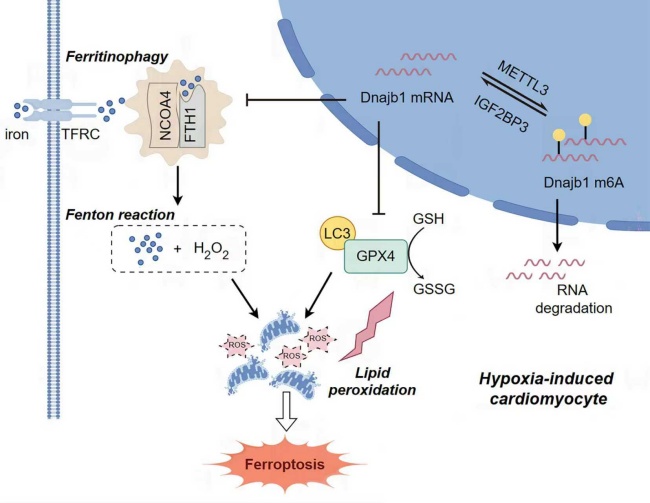 本研究通过整合分析MI小鼠心肌组织的甲基化RNA免疫沉淀测序(MeRIP-seq)和RNA测序(RNA-seq)数据,鉴定出在缺血心肌损伤中N6-甲基腺苷(m6A)修饰增加且mRNA丰度下降的关键基因DNAJB1。进一步研究发现,MI诱导的METTL3上调通过m6A修饰降低了Dnajb1 mRNA稳定性,导致核心蛋白GPX4的溶酶体降解,从而驱动心肌细胞铁死亡。本研究揭示了m6A表观遗传修饰在缺血性心肌损伤中的关键调控作用,从而为将来MI的靶向治疗指明了方向。