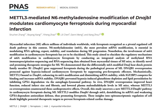 近日,我校第二附属医院心血管中心周祥教授团队在国际著名期刊PNAS上发表了题为“METTL3-mediated N6-methyladenosine modification of Dnajb1 modulates cardiomyocyte ferroptosis during myocardial infarction”的研究论文,阐明了METTL3/Dnajb1/GPX4轴在心肌梗死中的调控机制。