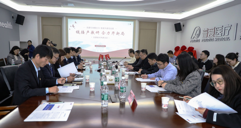 在支部联学共建部分,科研院党支部江胜强书记致辞指出,此次活动是贯彻落实习近平总书记“在促进创新链产业链资金链人才链深度融合上探索新途径”重要指示精神的具体实践,希望四个支部以今天的结对共建为起点,常来常往、真联真建,真正把党建共建的“势能”转化为推动产教研深度融合、服务“健康中国”建设的强大动能。普爱医疗负责人聂新坤先生在致辞中表示,公司始终重视与高校的互动交流,期待四个支部未来在技术攻关、人才培养、成果转化等更多方面开展深度合作,共同推动产教研融合走深走实,进而真正达到共建双赢的目标。