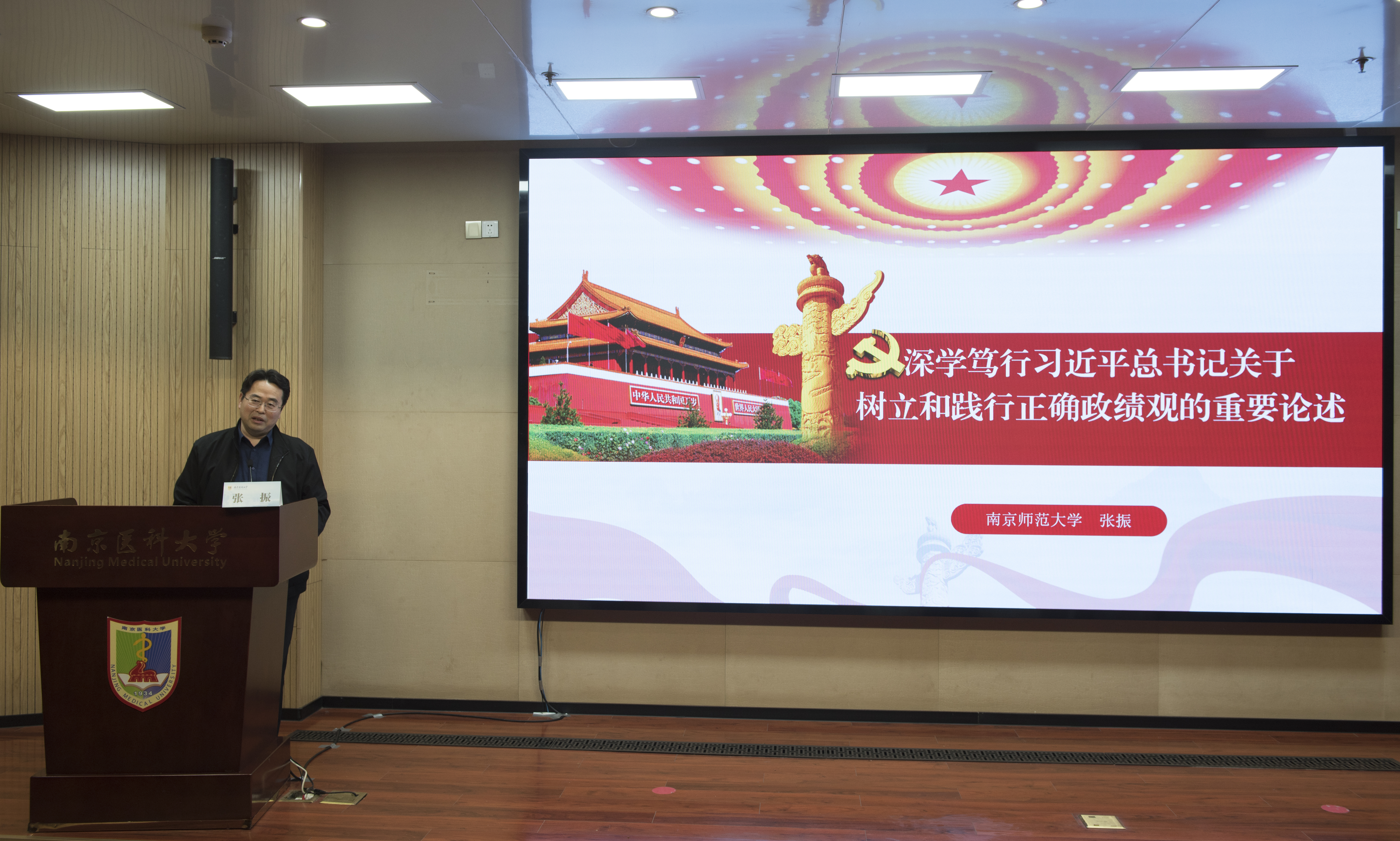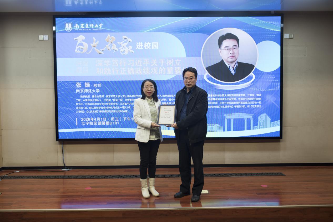 4月1日,2026年南京医科大学“百大名家进校园”系列学术讲座在江宁校区德馨楼D101报告厅隆重召开。南京师范大学人文社会科学研究院院长张振教授受邀为我校师生带来题为“深学笃行习近平总书记关于树立和践行正确政绩观的重要论述”的学术报告。南京医科大学马克思主义学院院长巩茹敏、副院长陶林,科研院医学伦理与人遗办公室主任蒋涛出席本次活动。