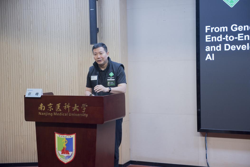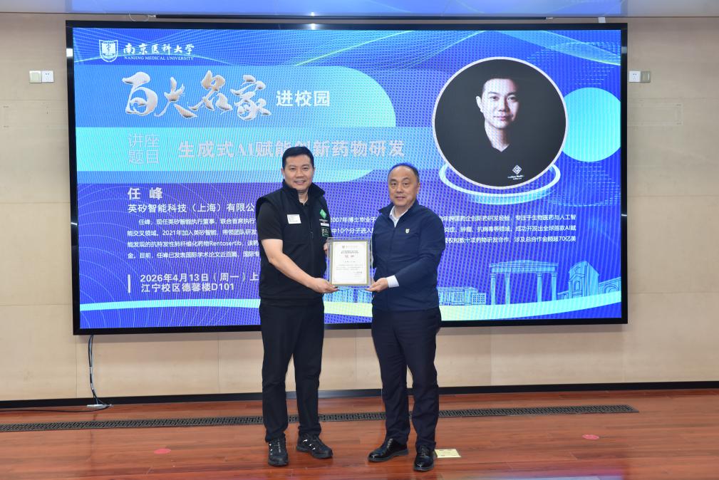4月13日,2026年南京医科大学“百大名家进校园”系列学术讲座在江宁校区德馨楼D101报告厅隆重召开。英矽智能科技(上海)有限公司执行董事任峰博士受邀为我校师生带来题为“生成式AI赋能创新药物研发”的学术报告。南京医科大学副校长韩峰、科研院医学伦理与人遗办公室主任蒋涛、药学院教授李飞、厉廷有、张涛等出席了本次活动。