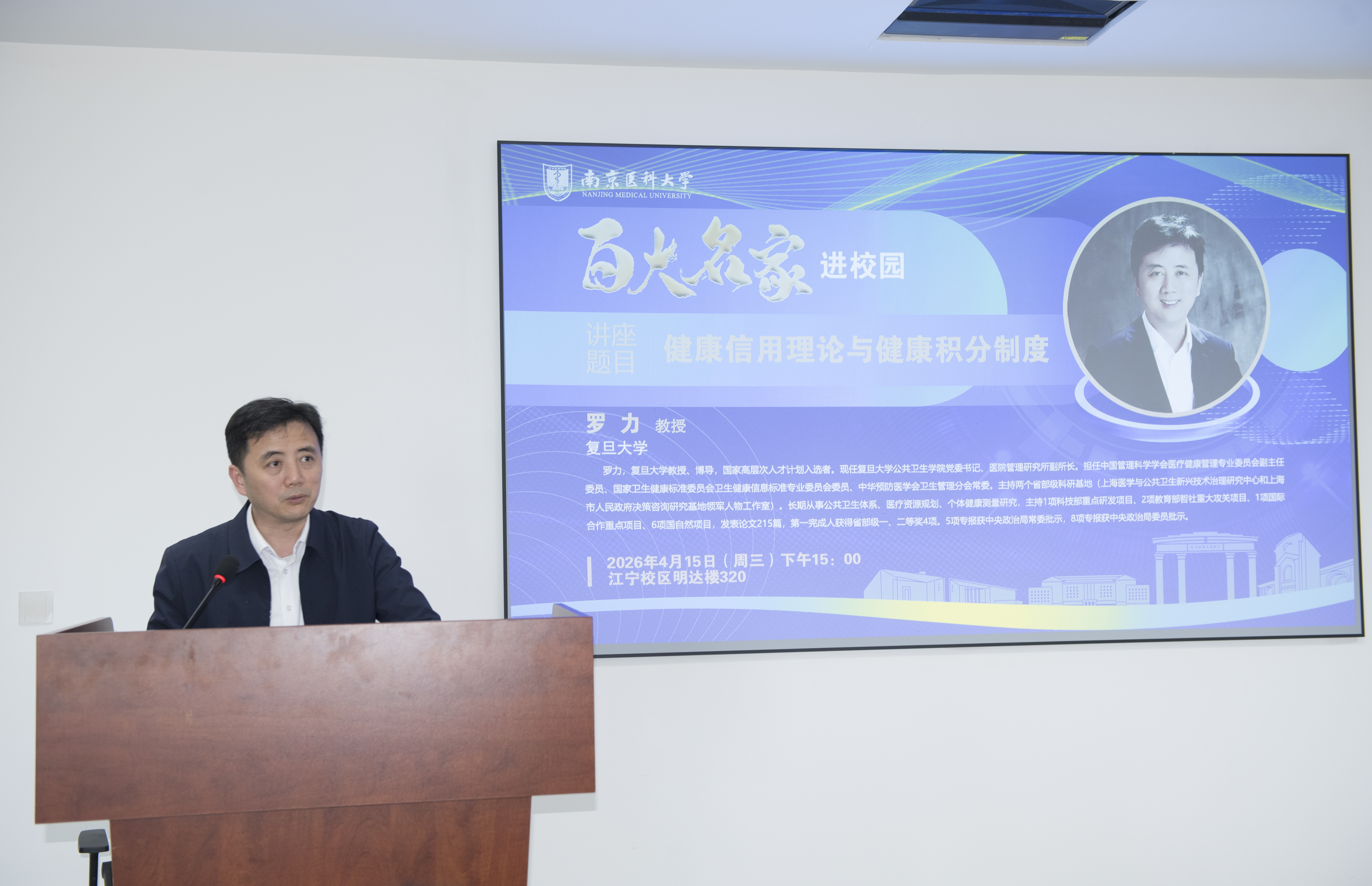 4月15日,2026年南京医科大学“百大名家进校园”系列学术讲座在江宁校区明达楼320报告厅顺利举行。复旦大学罗力教授受邀为我校师生带来题为“健康信用理论与健康积分制度”的学术报告。南京医科大学科研院规划处处长周其冈,医政学院院长钱东福、副院长陈鸣声、姚俊等出席了本次活动。